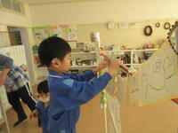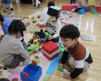 大型積木で作ったバスに乗り合ってみたり、たくさんあるブロックで乗り物や怪獣を作って友達同士で見せ合ってみたり、大小さまざまな大きさのフープを並べて順番に跳んでみたりと、いろいろな友達となかよく遊ぶことができました。