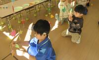 「こっちにもう1つつけてみようかな。」「もっと大きいのがいいかな?」試行錯誤して出来上がったモビールは、今、窓辺でゆらゆら揺れています。