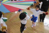 そして、10月5日(土)運動会当日・・・残念ながら雨雲が居座ってすっきりと晴れなかったので、あさひ保育園のホールで実施しました。開会式、障害物競争「トトロの森の大冒険」、バルーン、紅白リレー、閉会式と友達と一緒に競技も応援もがんばりました。