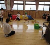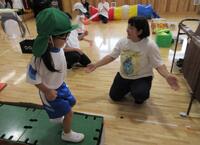 お楽しみのゲームでは、「けいどろ」と「宝探しゲーム」を行いました。幼児と児童が一緒に身体を動かしながら楽しく交流し、会場は笑い声に包まれました。
