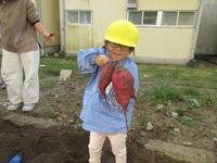 掘る前に子どもたちは、「10本取れると思うよ。」「私は20本だと思うなあ。」などと予想をしてからいざ畑へ!年長さんとして、何度か経験があるため、さつまいも掘りにも慣れたもので、「この辺にありそうだ。」「手伝って~。」と積極的に、そして協力してどんどん掘り出しました。