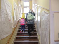 洪水を想定した避難訓練で、南校舎の2階に避難しました。緊急(訓練)の放送を聞いた後、子どもたちは先生の話を聞き、自分の荷物を持って、スムーズに避難することが出来ました。