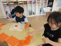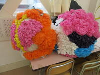 5月から「どんなデザインにしようかな?」と考え、そのアイディアをもとにコツコツと制作してきました。デザインは幼稚部の5歳児が担当し、その図柄に合う色のお花紙を丸めたり、飾りつけたりするのは小学部の子ども達にも手伝ってもらいました。