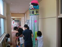 仕上げに家族や放課後子ども教室、そして先生にも書いてもらった短冊を吹き流しにつけて完成です。