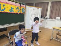 2つ目は、「同じ仲間を探そう」です。声は出さずに伝えるというルールで行い、子どもたちが工夫して、身振りや空書きなどで伝え合い、同じ仲間を作っていました。
