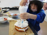 ケーキ作りでは、作り方の説明も児童が担当し、みんなで協力してケーキを作りました。