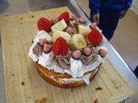 話し合いで役割分担を行い、ケーキの材料や作り方を調べ、材料を近くのスーパーに買いに行って準備を進めてきました。