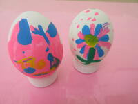 昨年度の県立図書館の移動図書館「あずま号」から借りた絵本にちなんで『私たちも学校の中で卵探しがやりた~い』という声があったので、お家の人や職員室の先生にも協力していただいて集めたたくさんの卵の殻に、思い思いに色を塗ったり絵を描いたりしました。